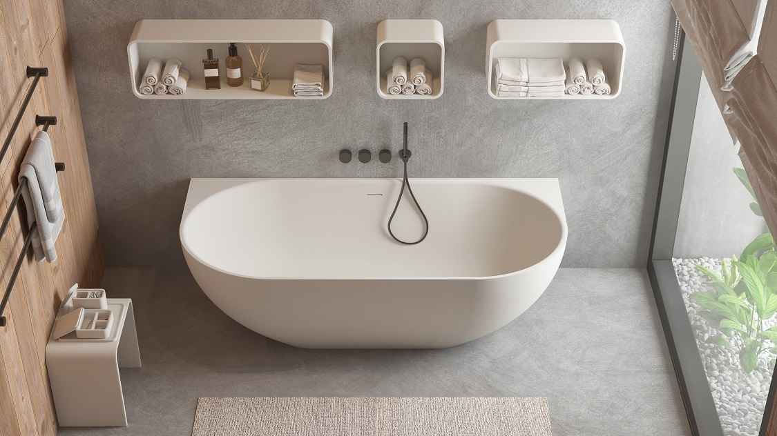 Solid Surface Back to Wall Bad Solidnova, Afmeting: L.180 x B.80 x H.56 cm, Gewicht: ca. 182 kg, inhoud 329 liter. Half vrijstaand bad in mat wit Solid Surface verkrijgbaar. (Corian, kleur Glacier White) Met interne overloop, inclusief Solid Surface mat witte pop up drain cover en sifon. De gemonteerde sifon is volledig in de dubbele bodem weggewerkt. Met 10 jaar fabrieksgarantie